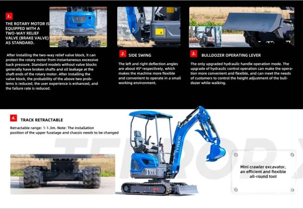 Wide Range of Uses: Thanks to its compact and user-friendly design as well as a flexible swing boom, this trencher digger machine is perfect for drilling, digging, grabbing, bull-dozing, ditch-cleaning, small excavations, rock-breaking, landscaping or construction purposes.